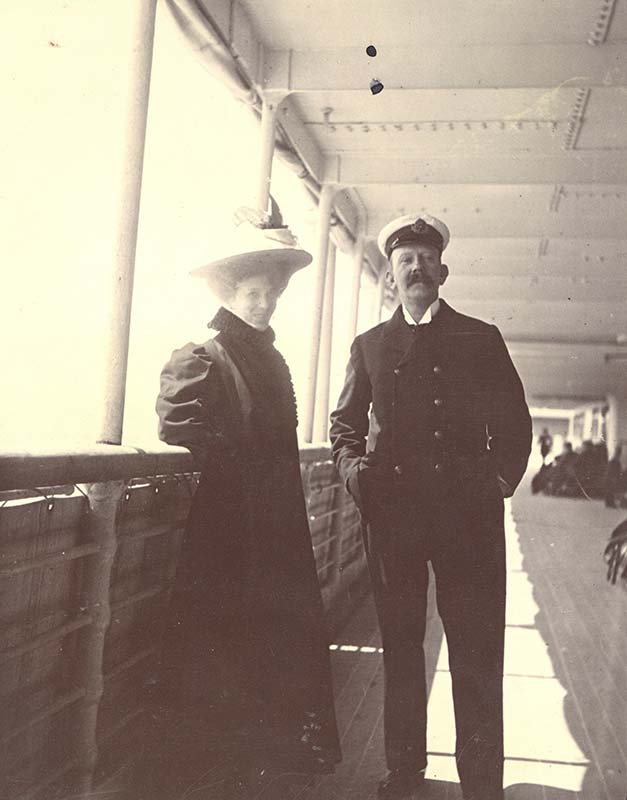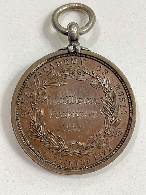 “My husband liked to be comfortable and at ease in his recital work. If it meant being uncomfortable to be in style, then he was not in style. Nothing could induce him to wear a “boiled” shirt, the bosom of which might bulge during the rendition of a number; nor could he be induced to wear starched cuffs. His dress shirts were specially made of white silk, finely tucked with soft, turned back cuffs. His cuff links were plain solid gold on which his crest was engraved. Before starting his program, he discarded his evening coat for a black alpaca, which at a distance resembled his dinner jacket. This was worn at thousands of recitals and is still a keepsake for the family today. He was never fussy about shoes. He always wore ground grippers made to order and never kept any special pair for his recital work. A very ardent admirer, who was treasurer for a big shoe firm and was also an organist, borrowed one of Lemare’s shoes and later presented him with two pairs—a black and a tan—bench made and with his name in guilt letters inside the shoes. For many years this was an annual present.”